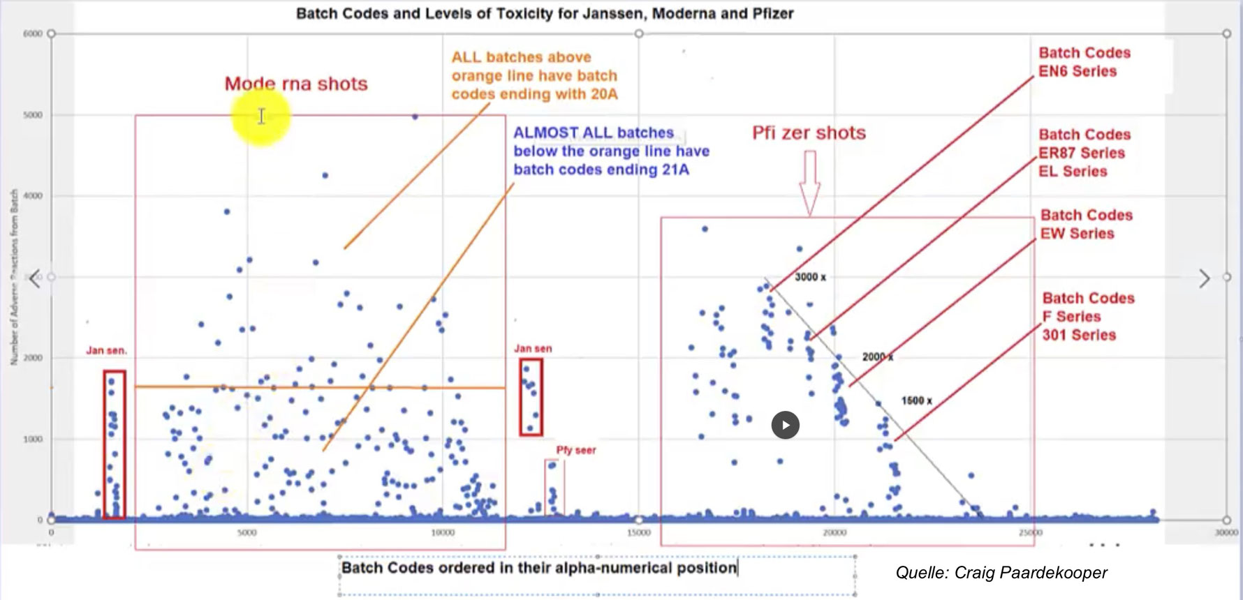 Craig Paardekooper und andere haben die US-amerikanische Datenbank VAERS, in der die Schäden in engem zeitlichen Zusammenhang mit der Verabreichung der Präparate von BioNTech/Pfizer, Moderna und Janssen dokumentiert werden, einer genauen Analyse unterzogen. Dabei hat sich herausgestellt, dass die einzelnen Chargen der sogenannten Impfungen eine extrem unterschiedliche Toxizität aufweisen. Bei einigen Chargen ist die Toxizität um bis zu 3000-fach erhöht. Die Impfentscheidung wird dabei zum russisch Roulette.